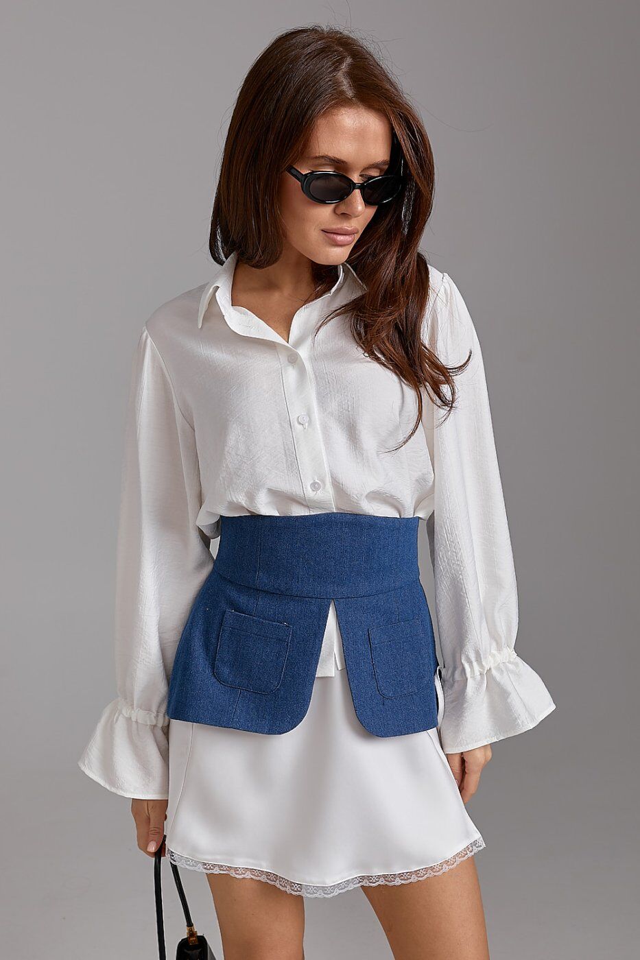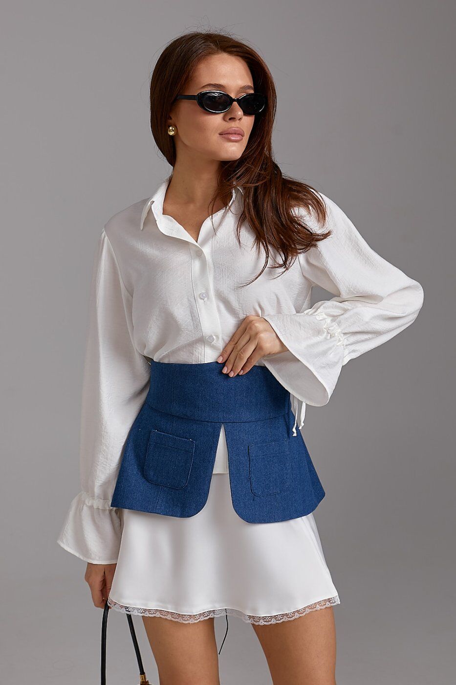 Додайте зухвалості та структури вашому гардеробу з акцентною джинсовою баскою ARTMON. Цей аксесуар миттєво перетворює звичайну сорочку, сукню чи футболку на дизайнерський look. Виконана з щільного котону класичного синього кольору, баска ідеально підкреслює талію, створюючи жіночний силует "пісочний годинник". Функціональні накладні кишені та асиметричний низ додають виробу сучасного урбаністичного стилю.