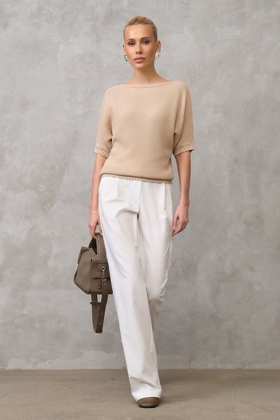 Бавовняний джемпер із лаконічною горловиною човник. Виконаний фактурною в'язкою середньої щільності, м'який та приємний до тіла. Комфортний рукав "летюча миша". По низу виробу фіксуючий манжет-резинка.